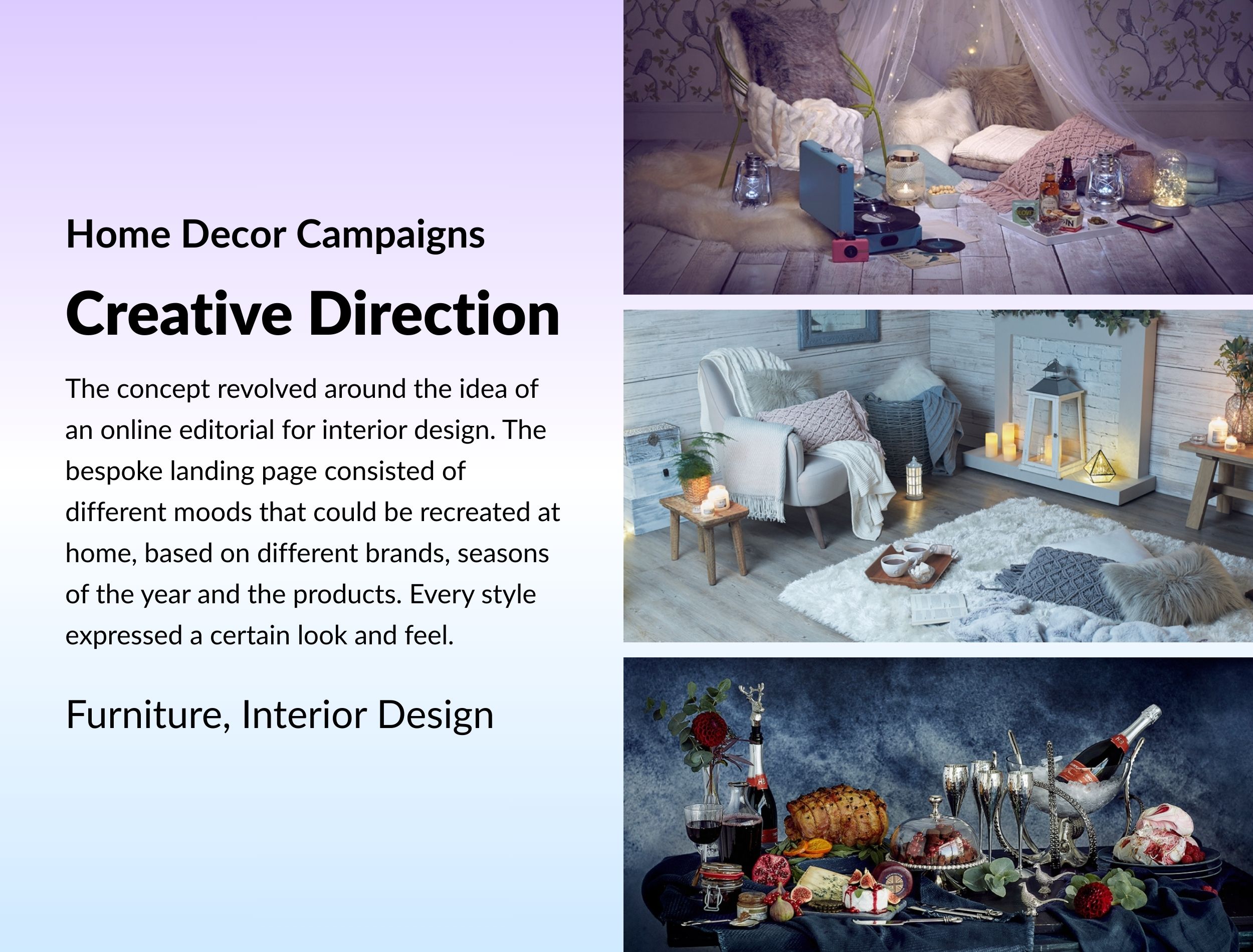The concept revolved around the idea of an online editorial for interior design. The bespoke page consisted of a number of different moods that could be recreated for furniture products at home, based on different brands, seasons of the year and the products in stock. Every style had a specific title that expressed a certain look and feel.