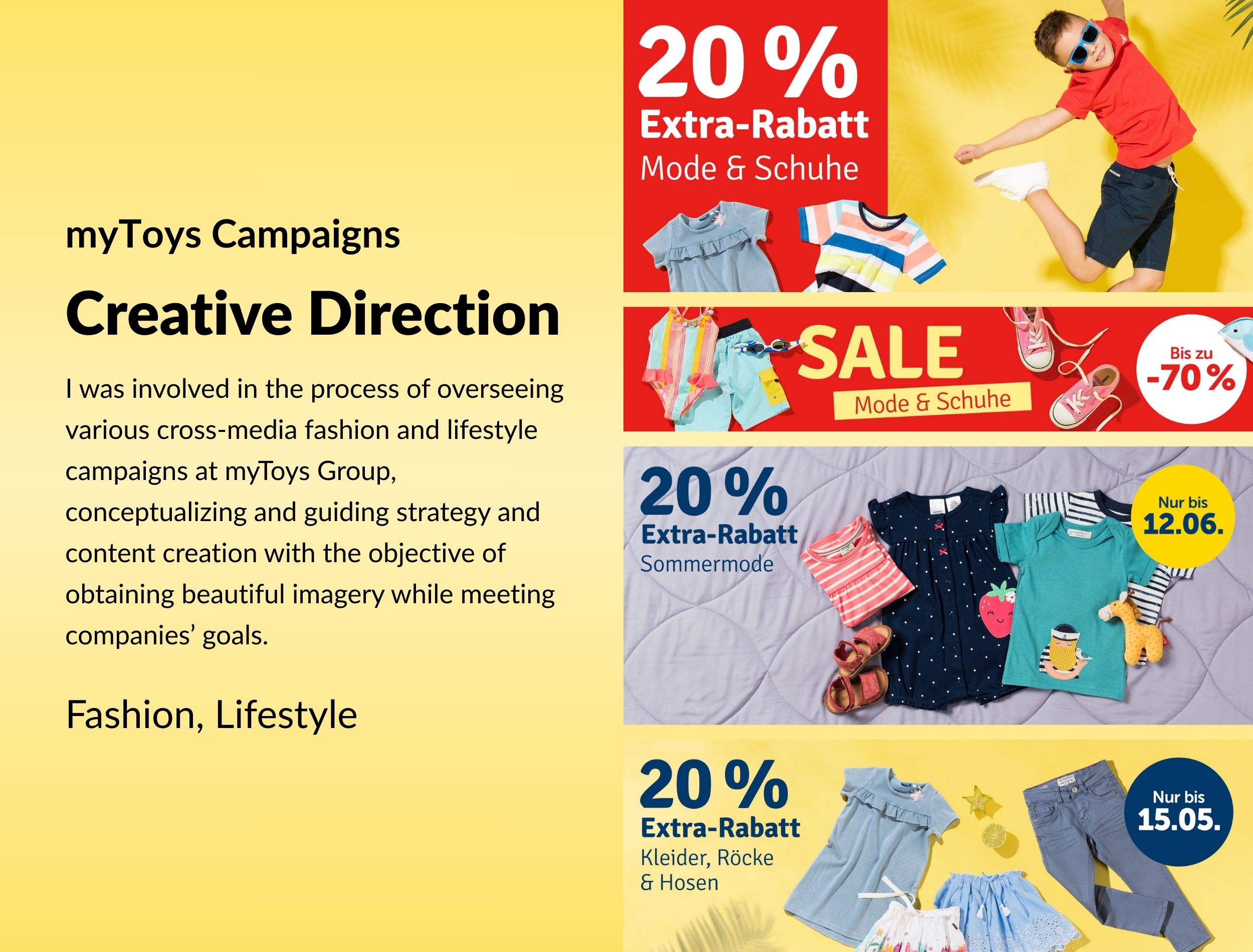 myToys, the second-leading toy and children's fashion company in Germany, celebrated its 20-year-anniversary in 2019. An an employee in the Creative Team I was responsible for the entire visual campaign during that period. In collaboration with a multitude of stakeholders from the marketing department I designed various layout mockups, landing pages, online banners and the official logo for the anniversary promotions and content on the company's website. It was a big cross-media campaign running for several weeks across different in-house promotional channels.