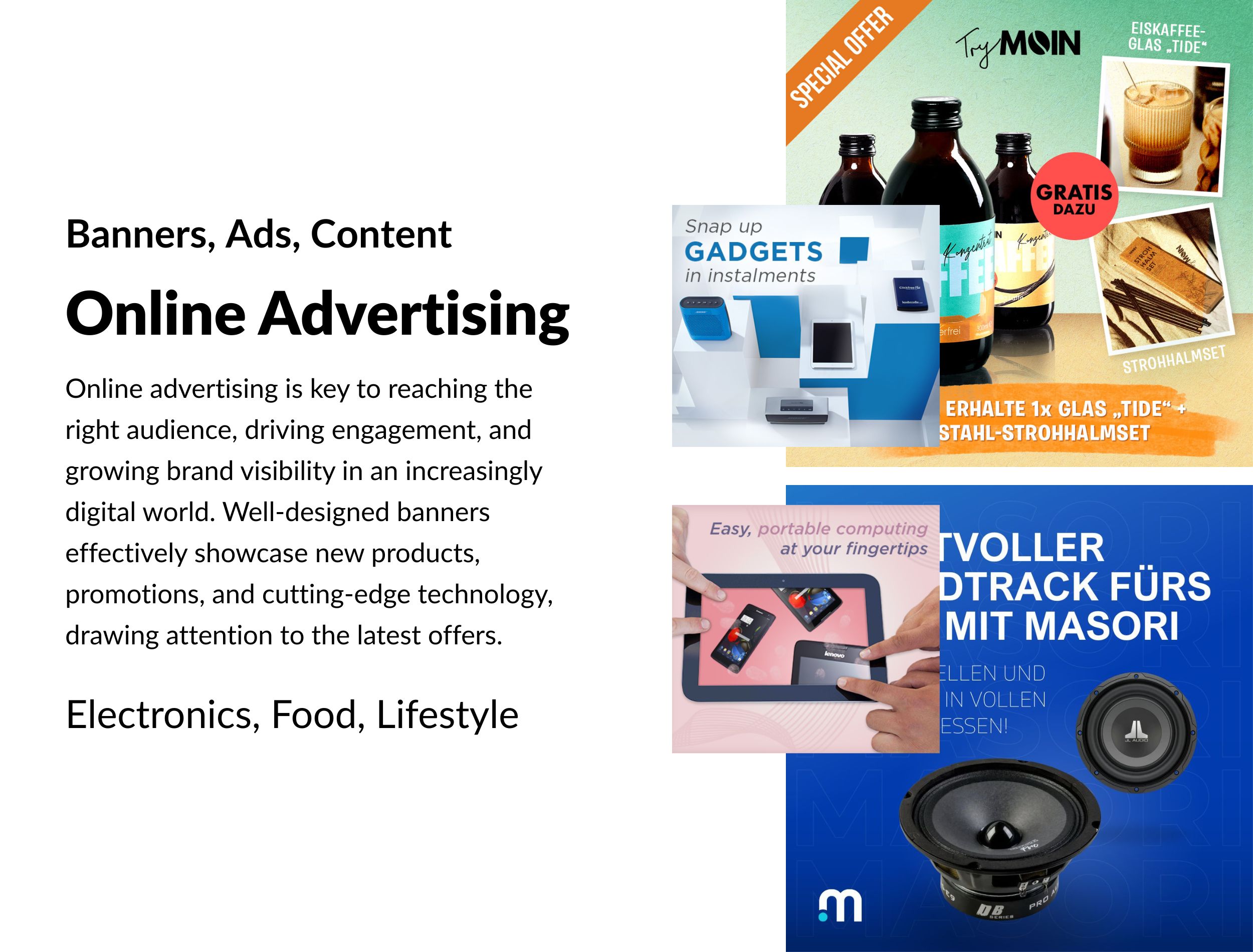 I worked with a performance marketing agency for Masori, an electronics store specializing in car electronics, to design static online images for their ads. The client was very challenging and demanding, pushing for perfection in every detail. We went through many iterations to refine the designs, ensuring they met their vision for clean and modern layouts. I carefully selected a color palette that aligned with their brand while making the ads visually striking and professional. It was crucial to balance bold visuals with clear, concise messaging that resonated with their audience. In the end, we achieved designs that effectively showcased their products and boosted their brand presence.