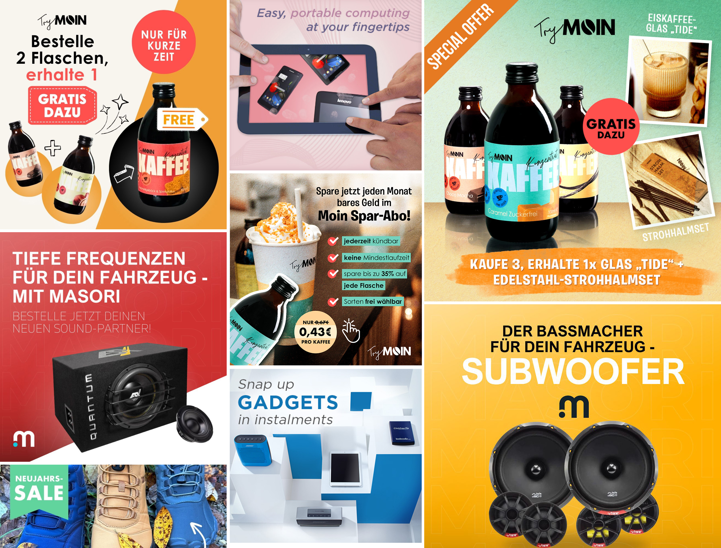 Here's a selection of a number of banners that I designed for 4 different clients, either through performance marketing agenceis or being directly involved with the client. As you can see from the number of material it all depens on the brand's key messaging, the product or service they sell, and the existing Corporate Identity that they utilize on their website. With this knowledge I was able to create the right look and feel for the customer's needs.